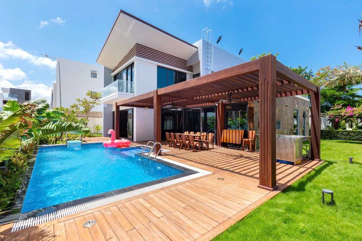 Esta es una VILLA CON PISCINA PRIVADA FRENTE A LA PLAYA DE 4 DORMITORIOS + 4 baños, pertenece a la fase 2 del centro vacacional Sanctuary Ho Tram. - Superficie: 492 m2. - 4 dormitorios dobles (incluidos 3 dormitorios dobles con balcón con baño en suite + 1 dormitorio doble en la planta baja que utiliza el baño fuera de la habitación). - Alojamiento para 8 adultos + 4 niños menores de 11 años. - Enorme terraza para tomar el sol y entretenerse. - Jardines paisajísticos tranquilos y tropicales. - Cocina totalmente equipada - Piscina privada. - Aparcamiento cubierto.