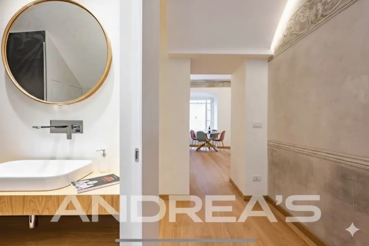 Apartamento imperial de diseño elegante con frescos originales, los dos majestuosos ventanales ofrecen una vista espectacular del famoso Palazzo San Giorgio. El apartamento destaca por su refinamiento y por el carácter único que le da el altillo, que alberga la zona de noche. Las escaleras que conducen al altillo están adornadas con frescos históricos y antiguas vigas de madera a la vista, lo que sumerge al huésped entre el arte y la historia.