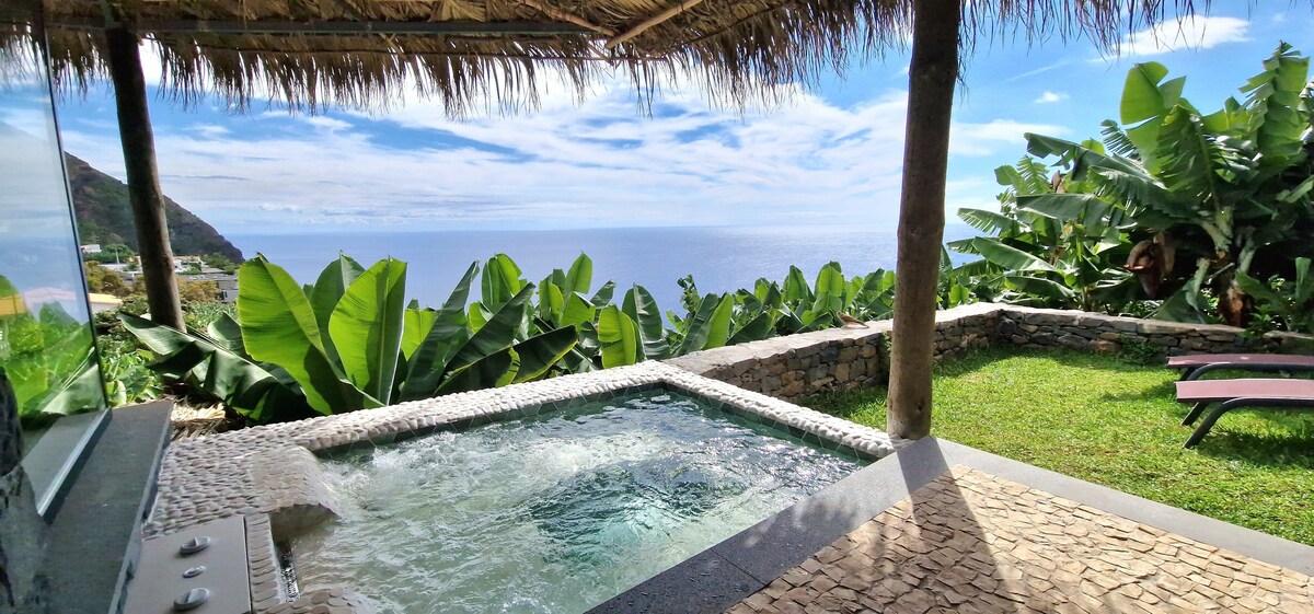 Esta magnífica, moderna y privada villa Miradouro da Baleia (Whale Watchtower) tiene algunas de las mejores vistas al océano y las montañas de la isla, con una piscina infinita y ubicada en un lugar privilegiado rodeado de espectaculares acantilados, tierras de cultivo, plantaciones de plátanos y viñedos, fue cuidadosamente y con buen gusto restaurado/construido en 2018 ofreciendo una experiencia única de un alojamiento de verano portugués.