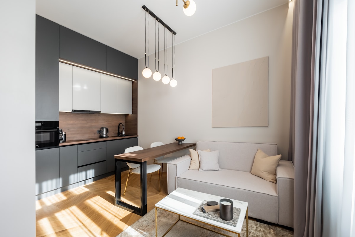 Precioso apartamento estudio a estrenar con entrada privada al parque situado justo en el centro de la ciudad, en la calle Caka. Diseñado con elegancia y detalles modernos en mente, este apartamento tipo estudio es cálido, soleado y muy tranquilo. Sin embargo, detrás de las puertas encontrarás una calle concurrida con cafeterías, boutiques y supermercados. ¡Estás justo en el centro de Riga! El casco antiguo está a menos de 3 km o a pocas paradas de transporte público disponible a la vuelta de la esquina. Perfecto para viajes de trabajo o de placer, tiene capacidad para hasta 2 huéspedes.
