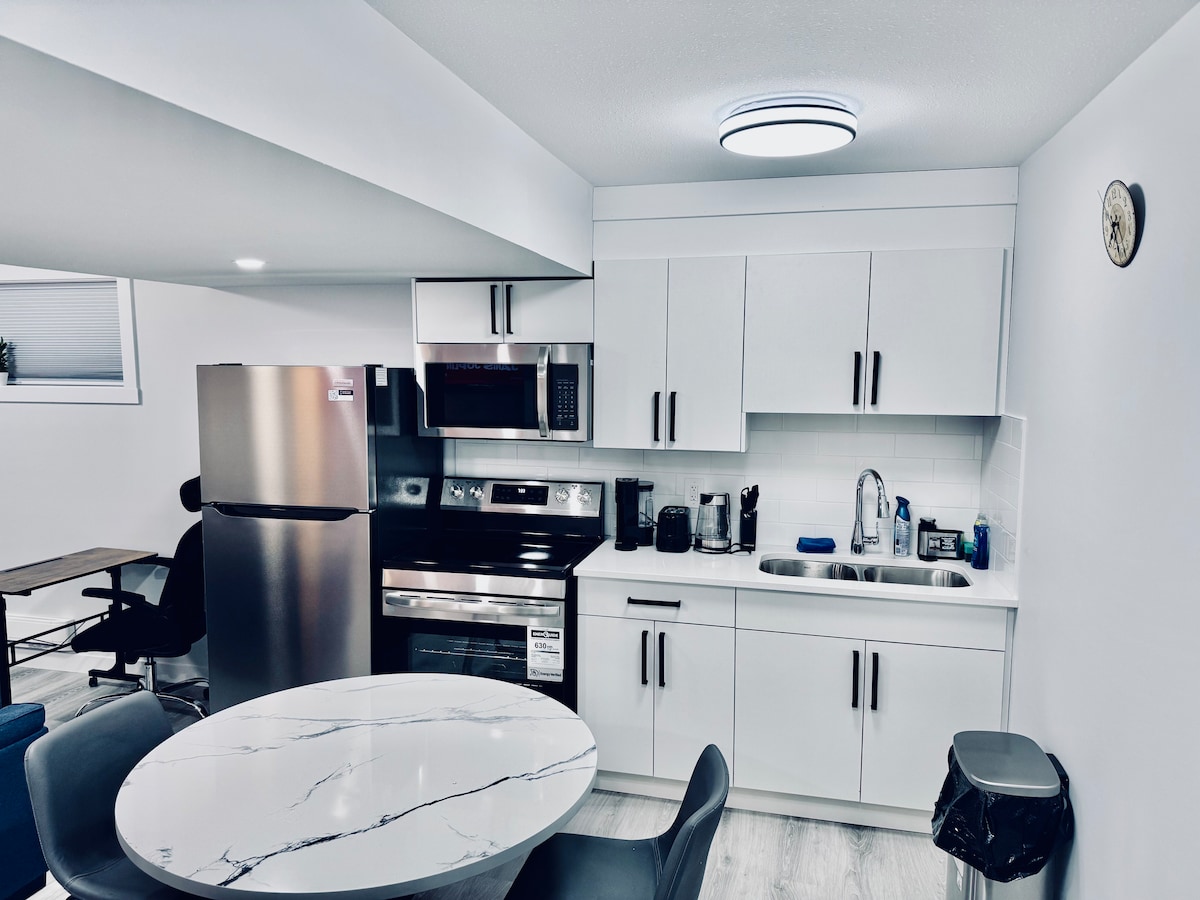 Disfruta de la comodidad y conveniencia que ofrece esta acogedora suite en el sótano en la tranquila zona de Greens. Crea recuerdos inolvidables en esta villa única ideal para familias. Está a 5 minutos en coche de Costco y a 8 minutos en coche de Walmart y Superstore. Este espacio superlimpio tiene una cómoda cama tamaño queen y aparcamiento gratuito. Cuenta con internet de alta velocidad de 325 Mbps wifi, TV inteligente de 40 pulgadas que incluye acceso a Prime Video y Netflix. La cocina pequeña tiene elementos esenciales como microondas, nevera, jarra de agua caliente, cafetera y tostadora.