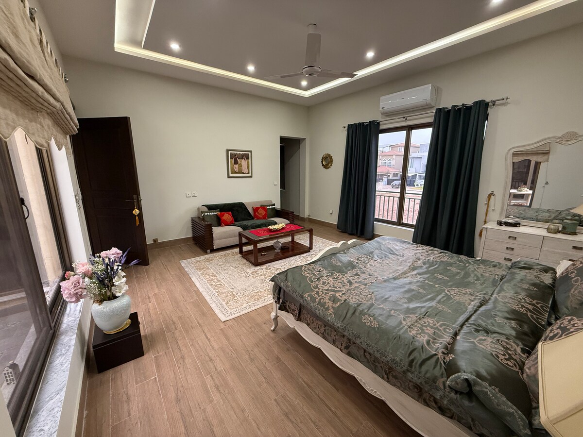 Estancia en ático moderno, lujoso y estético en DHA Phase 2 Islamabad. Diseño industrial con patio jardín, llegada autónoma, TV inteligente con Netflix incluida, wifi rápido, cocina totalmente equipada (fogones, microondas, nevera, hervidor de agua, utensilios y cubiertos), baño abastecido y colchones de repuesto, jardín privado en la azotea con asientos, impresionantes vistas. Ubicación privilegiada cerca de parques, centros comerciales, restaurantes, cafeterías, a solo 2 minutos en coche de Central Park, a 5 minutos de Giga Mall, a 12 minutos de Bahria Town (todas las fases) y a 1 hora del aeropuerto.