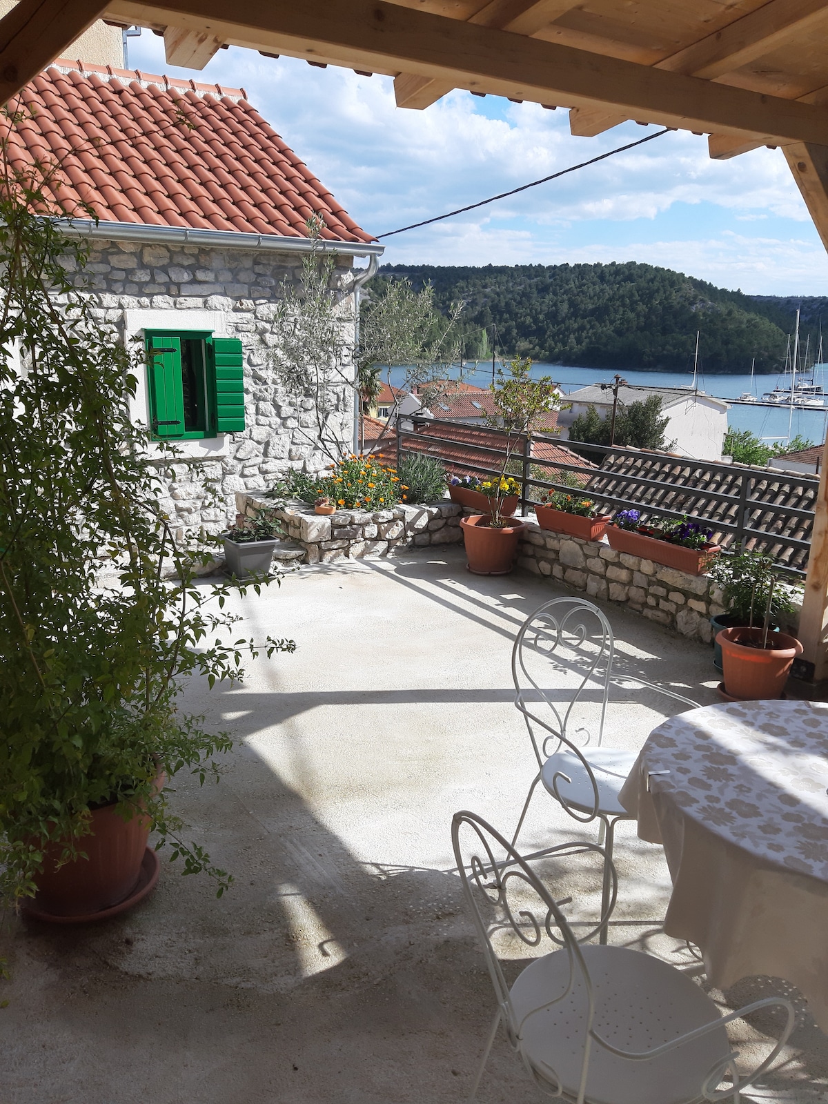La casa está situada en la hermosa bahía del río en Skradin con vistas al puerto deportivo de ACI y está cerca del punto de partida del barco para las cascadas del parque nacional Krka. El gran jardín contiene plazas de aparcamiento. El apartamento tiene un dormitorio separado con cama doble y baño con ducha a ras de suelo. La terraza es agradable para desayunar o tomar el café por la mañana. Barbacoa disponible. La terraza común es muy atractiva para la relajación. Mercados más cercanos, restaurantes, playas distantes a solo un par de cientos de metros. 23 escaleras.
