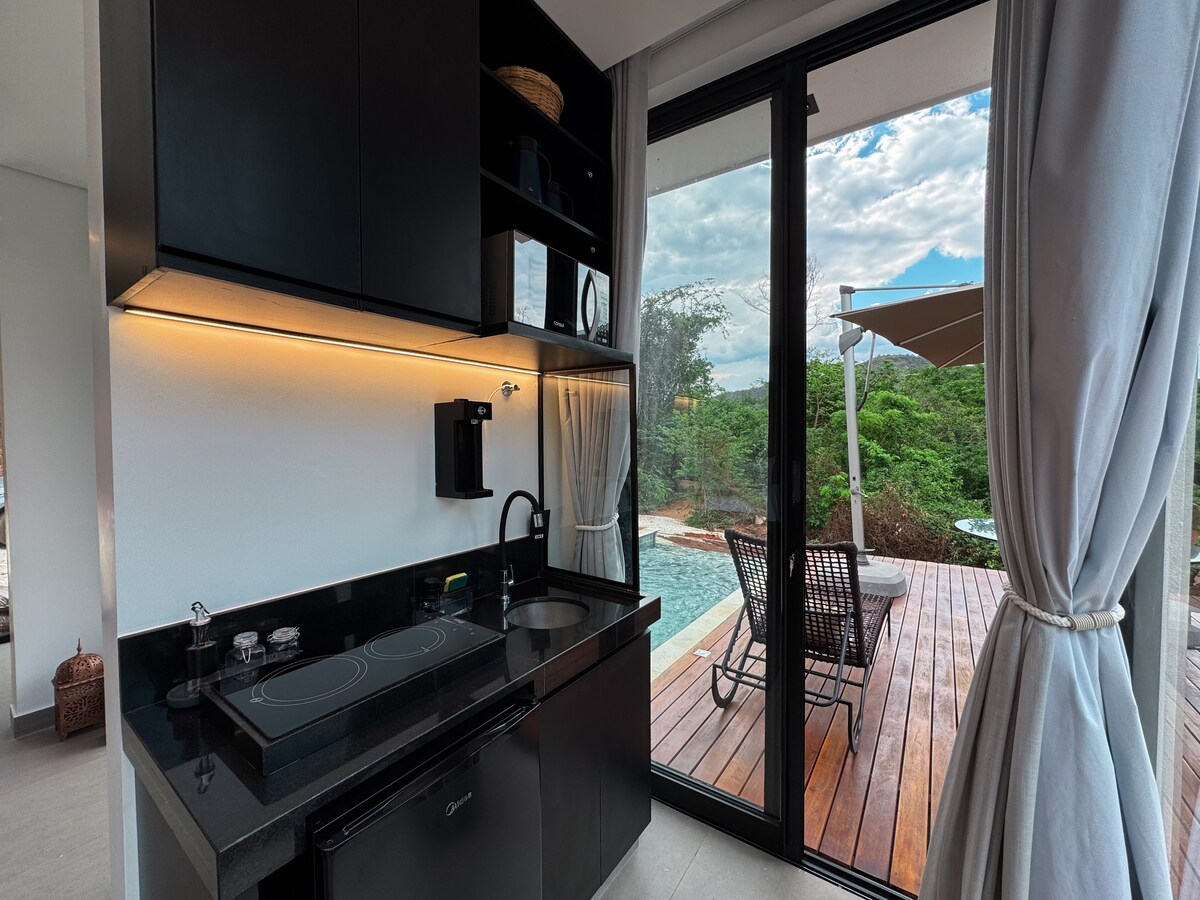 El Mirante Bungalow es una suite exclusiva y privada para parejas. Situado en Macoã Ecolodge en Pirenópolis - GO, a 6 km del centro de la ciudad. 90 m² y una cama tamaño king Vista Vale - a 20 m del río Macoã Baño con lavabos dobles y ducha Secador de pelo Wifi Ropa de cama y baño Trousseau Aire acondicionado Televisión inteligente Cocina americana Cafetera Nespresso Desayuno (por separado) Zona de Foguera Piscina climatizada con acuario (sistema solar) con hidromasaje (dependiendo de la intensidad del sol) Estacionamiento. No se admiten mascotas