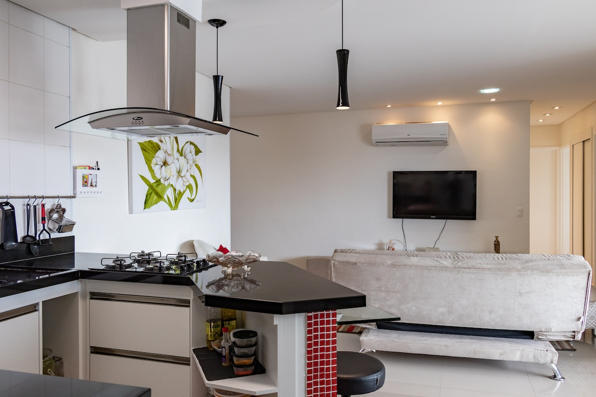 Este apartamento de 55 m² es ideal para parejas y ejecutivos en viajes de negocios. Cuenta con todo lo que esperarías de un apartamento: practicidad y tecnología. Para aquellos que vienen a pasar la Nochevieja en Santos, pueden disfrutar de las festividades sin siquiera salir del edificio. Desde la zona de la piscina, puedes disfrutar de las vistas al mar, los fuegos artificiales y el ambiente festivo de la ciudad sin tener que lidiar con el tráfico, las multitudes o un agotador viaje después de los fuegos artificiales.