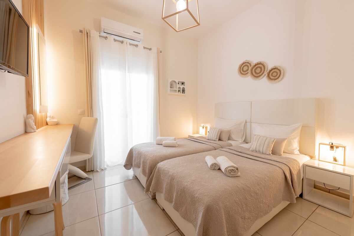 Este es el apartamento 3 de Isla Luxury Apartments en Creta, ubicado a solo 100 metros de la playa prístina de Adelianos Kampos y a solo 5 km del icónico centro de la ciudad de Rethymno. El apartamento cuenta con muebles de lujo y unas impresionantes vistas al mar Egeo. La joya de la corona de este lujoso apartamento es la terraza privada con bañera de hidromasaje privada, completa con una mesa de comedor, un cómodo sofá y tumbonas perfectas para relajarse y disfrutar de las impresionantes vistas del atardecer.