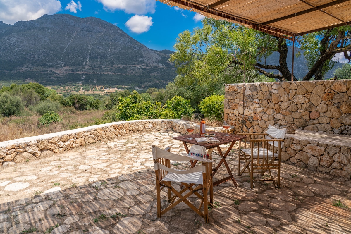 Eleni Cottage se distribuye en dos niveles con un dormitorio en el ático para 2 personas con ducha privada. El balcón del primer piso tiene unas vistas impresionantes del monte Ainos y del mar. En la planta baja hay una cama de matrimonio y una sala de estar. El espacio cuenta con un cómodo sofá, una cocina abierta totalmente equipada y un segundo baño con ducha. Eleni también disfruta del lujo de comer al aire libre dentro de los árboles.