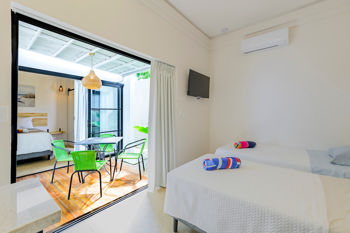 Desde esta ubicación en la cima de una colina sobre la bahía de Tamarindo, disfrutarás de una vista panorámica increíble. ¡A qué nos referimos cuando lleguemos! La Casita ofrece una cama tamaño king y una cama tamaño queen abatible, totalmente equipada con baño privado, cocina y un pequeño balcón con vistas al mar y perfecta para ver monos en los árboles circundantes. También tendrás acceso al espacio social de la propiedad, incluida una terraza cubierta con brisa junto a la piscina con vistas al mar y al salón en la azotea.