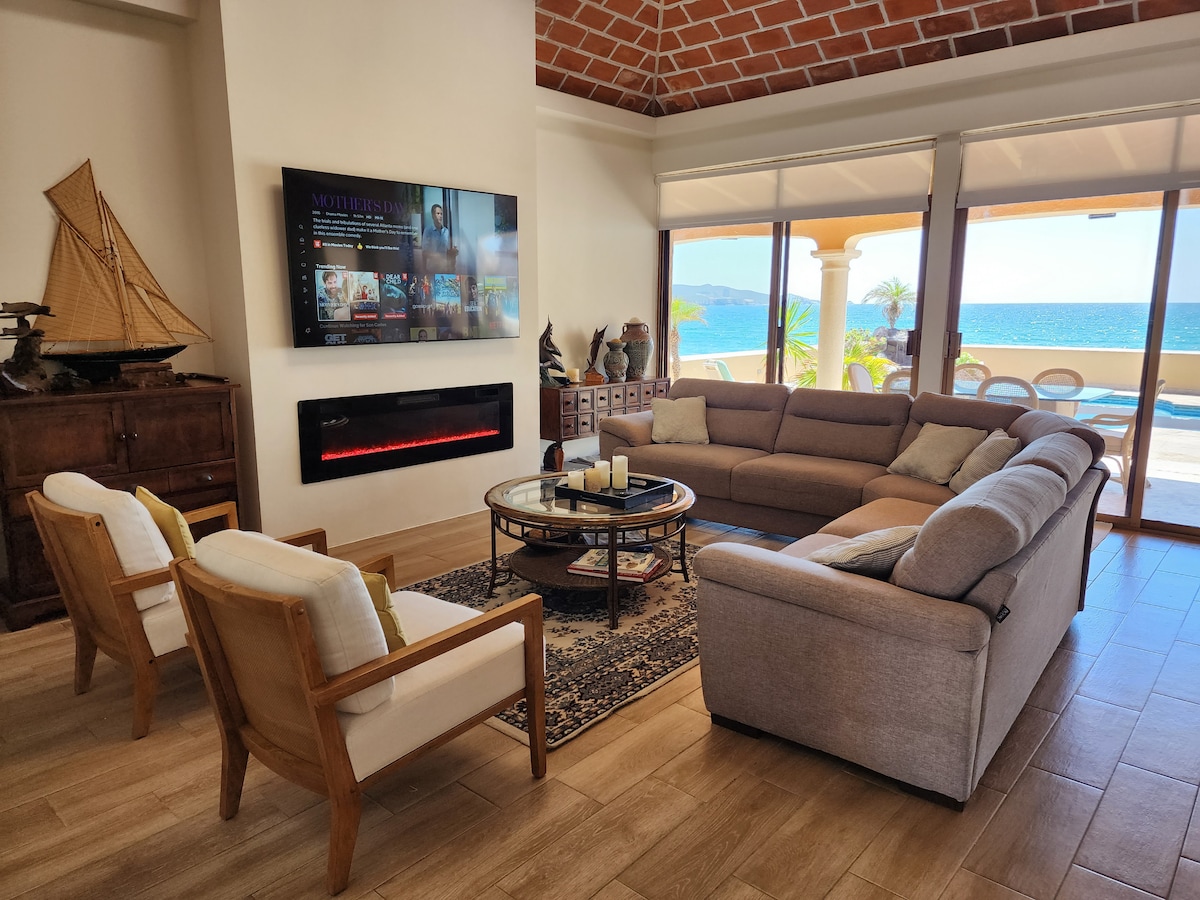 ¡ESPECTACULAR VILLA FRENTE A LA PLAYA EN EL MAR DE CORTÉS! SOLO ALQUILAMOS A UN SOLO GRUPO A LA VEZ PARA LA PRIVACIDAD DE LOS HUÉSPEDES Y EL DISFRUTE TRANQUILO. Piscina infinita privada con vistas a la bahía de San Carlos con más de 232 metros cuadrados de espacio habitable, terrazas, increíbles vistas al mar, a la piscina y a las montañas. Relájate en la piscina infinita y reúnete con amigos y familiares en el bar de la isla junto a la piscina y la cocina y parrillas al aire libre. Pasea por senderos bien iluminados y jardines con acceso privado a una playa apartada.
