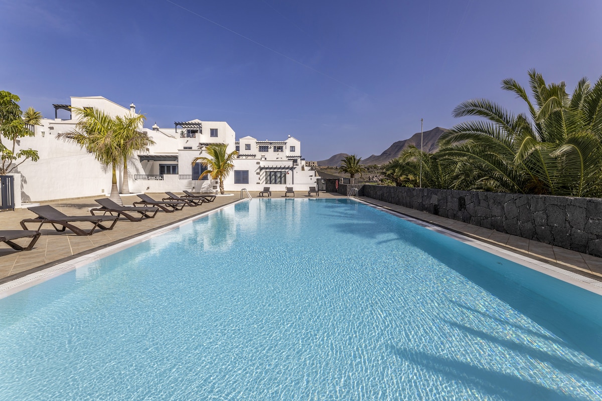 Casa esquinera muy acogedora y moderna con un gran jardín privado en la parte trasera y una piscina comunitaria muy bonita y grande, Wifi, plaza de aparcamiento privado, ideal para unas vacaciones agradables y relajantes, A 2 minutos a pie del paseo marítimo (cerca del mar), a 10 minutos de Marina Rubicón y 5 minutos de la tienda, jardín privado con palmeras y terraza ideal para relajarse y tomar el sol El complejo residencial Iris es hermoso y tranquilo