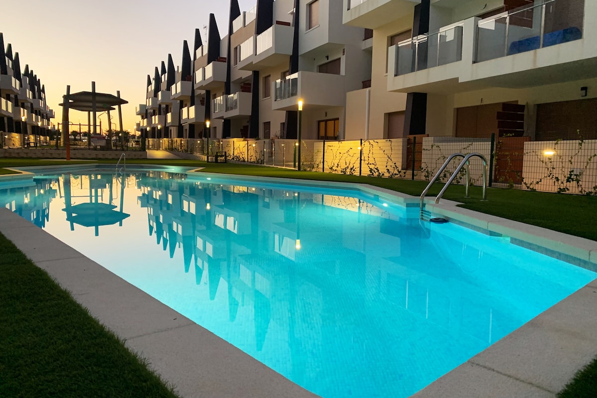 Buscas unas vacaciones en una localización moderna, a pocos metros de la playa? 'Bianca Beach' es perfecto para disfrutar en pareja, con familia o amigos. Construido en 2020, este residencial privado y completamente cerrado con muro perimetral tiene 2 piscinas. Está a 2 minutos andando de la playa Mil Palmeras, con 10 meses de sol al año. Este apartamento en planta baja está completamente equipado, con mucha luz. Lo más atractivo son sus terrazas, una con orientación sur y otra norte.