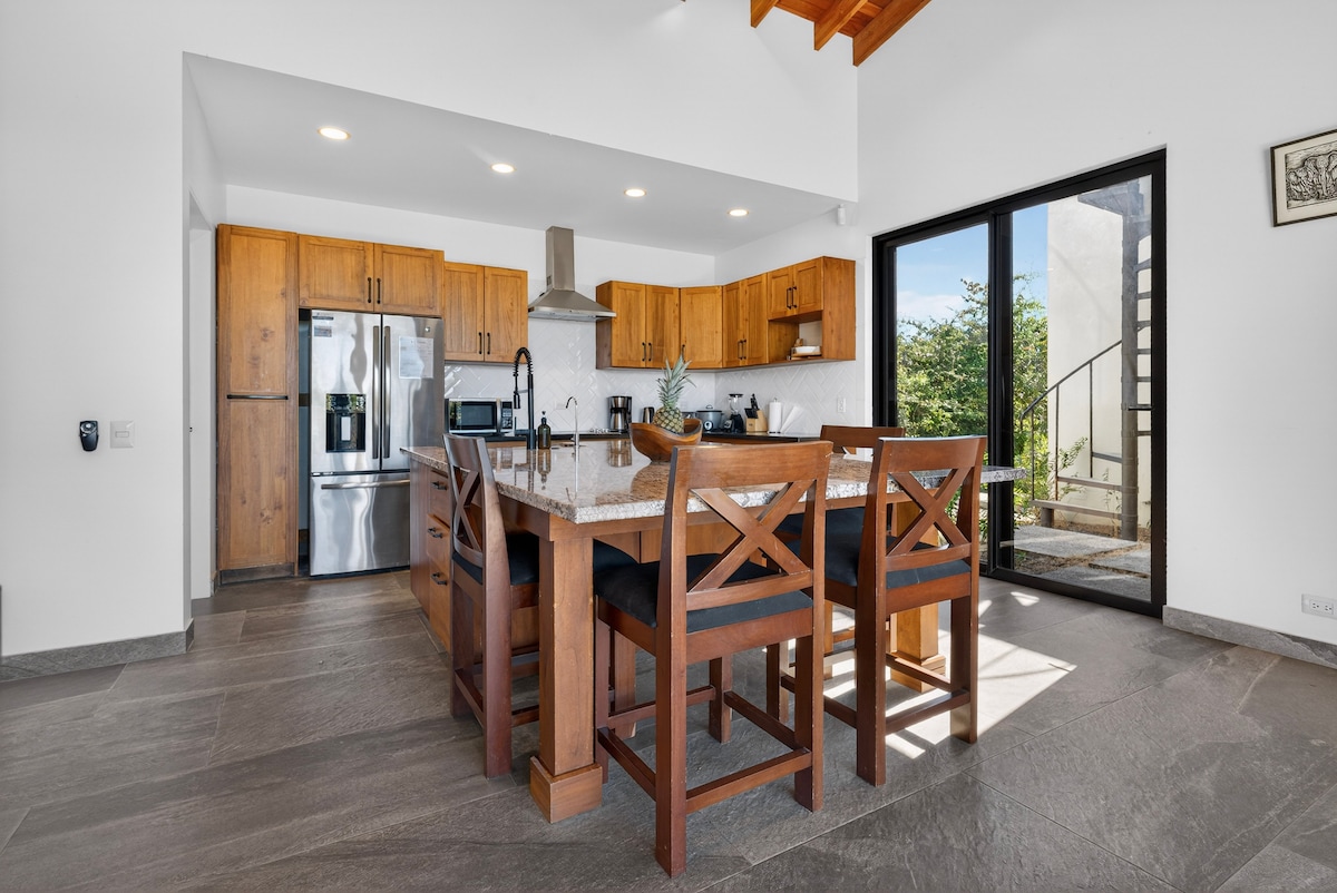 Desde esta ubicación en la cima de una colina sobre la bahía de Tamarindo, disfrutarás de una vista panorámica increíble. ¡A qué nos referimos cuando lleguemos! La Casita ofrece una cama tamaño king y una cama tamaño queen abatible, totalmente equipada con baño privado, cocina y un pequeño balcón con vistas al mar y perfecta para ver monos en los árboles circundantes. También tendrás acceso al espacio social de la propiedad, incluida una terraza cubierta con brisa junto a la piscina con vistas al mar y al salón en la azotea.