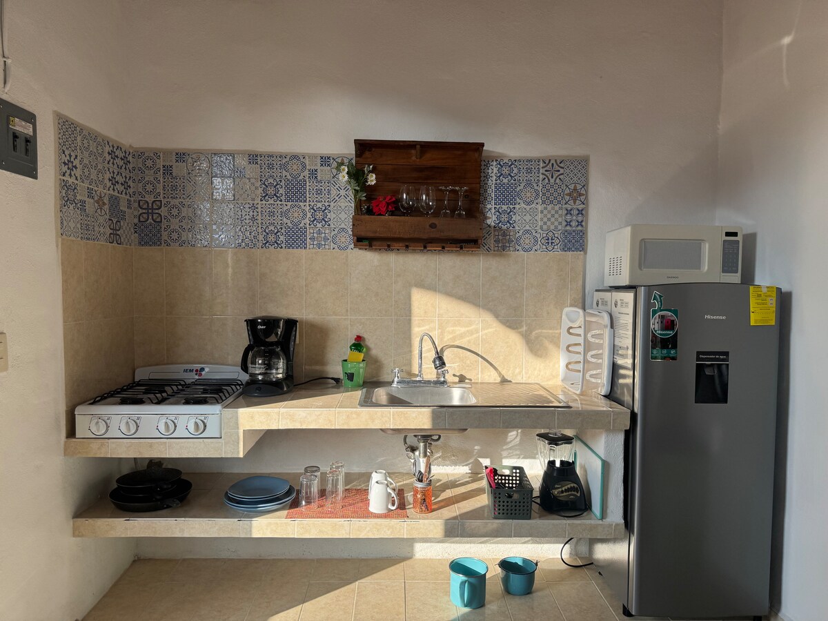 Casita #5 es tu propio apartamento completamente privado de 600 pies cuadrados en nuestra propiedad frente a la playa. Ideal para una pareja o un viajero soltero, las casitas ofrecen total privacidad dentro de la apertura del diseño del estudio. La parte delantera de las casitas se abre al patio a través de un enorme par de puertas francesas de 12 pies de ancho que traen la vista al mar y la brisa directamente a tu casita. Puedes preparar una comida en tu cocina y luego cenar en tu patio. La vista desde esta casita es desde el patio.