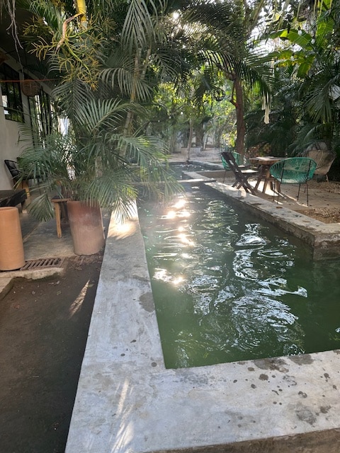 Con vistas a Playa Zipolite, a solo 5 minutos a pie de la playa y del pueblo, esta moderna casa de arquitecto de espacio abierto cuenta con 2 dormitorios insonorizados con aire acondicionado y camas tamaño king, cocina completa, baño exterior compartido, agua caliente presurizada y purificada, muebles modernos y cómodos, una pequeña piscina con vistas a la playa. Ideal para que 2 parejas o 4 amigos pasen varios días y disfruten de la vida fácil y lenta en la única playa nudista legal de México.
