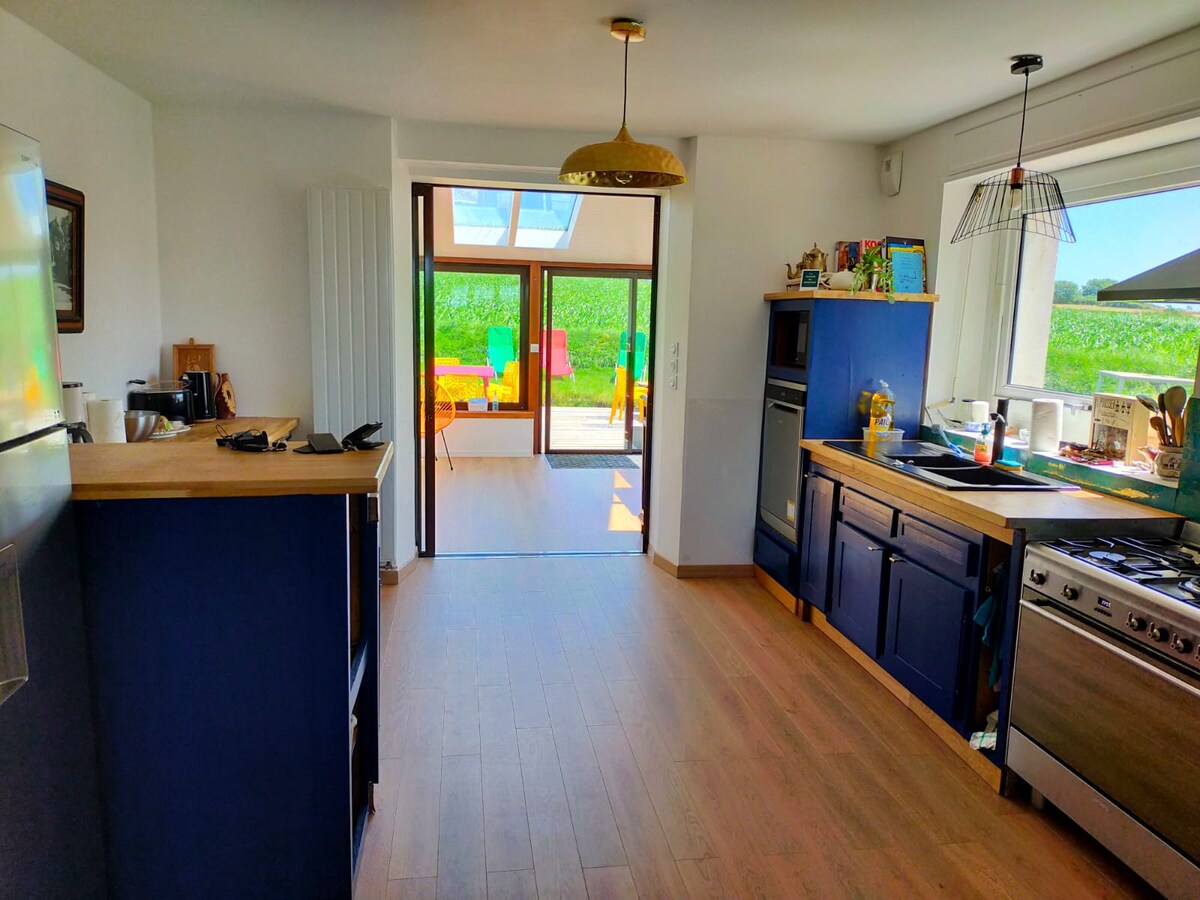 En un entorno verde, entre la tierra y el mar, a 3 km del centro de Plouvorn, y a 20 minutos de las primeras playas, venga a alojarse en una casa de campo acogedora, totalmente equipada, con terraza privada y aparcamiento privado, acceso al jacuzzi y disfrute del parque privado: 🌊 Cerca de las playas de Cleder, Carantec, Santec y Plougoulm ⏱ ️ A pocos minutos de Morlaix, Roscoff, Saint Pol de Léon y Landivisiau apto para👶 niños 🐕🦺 pet friendly