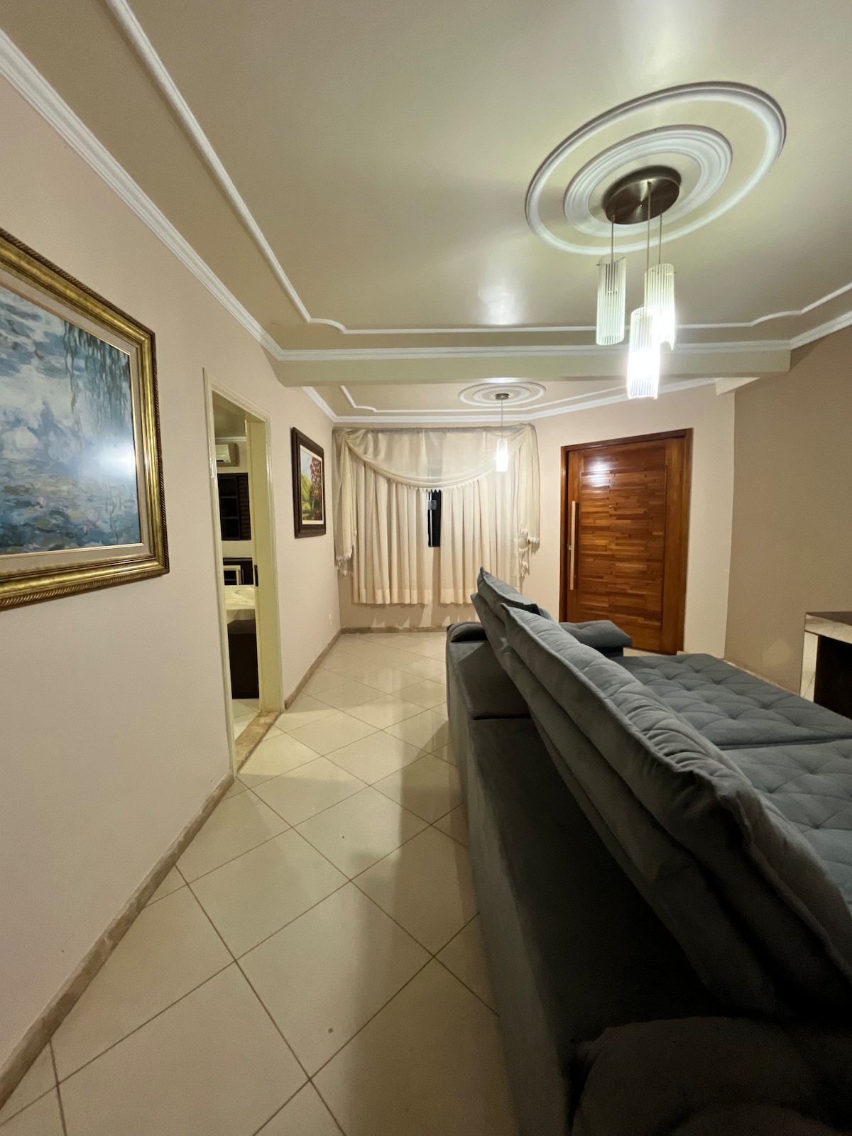 Comodidad ofrecida: se encuentra a 30 metros del aeropuerto de Ponta Porã; Los 2 centros comerciales más grandes de la frontera están a 900 metros. Televisión por cable. Toallas, ropa de cama. - 2 dormitorios, 3 sofás, una mesa para 6 personas, horno, microondas, nevera, cubiertos, ¡todo lo que necesitas! Aire acondicionado en el salón y en uno de los dormitorios, en el segundo tenemos un ventilador. Estaré presente en todo momento si necesitas ayuda. Desde el aeropuerto, camina 30 metros y llegarás aquí a este tranquilo alojamiento.