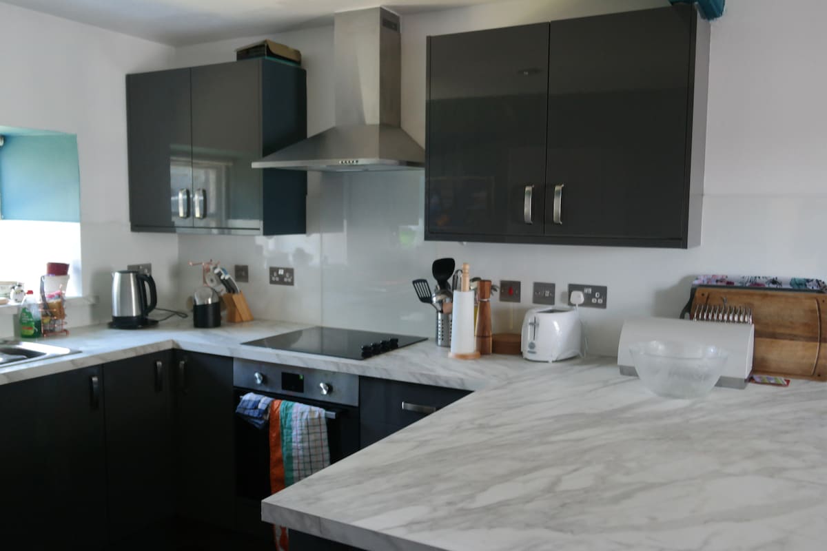 Este apartamento inferior tiene una cocina y un salón combinados. La cocina incluye microondas, tostadora y hervidor. Hay acceso a lavadora y secadora de tambor. Están en el cobertizo de madera más cercano a los pisos. Se proporciona TV. Se proporcionan mantas adicionales para los dormitorios. Hay espacio en el cajón y el armario. El piso se calienta con calentadores de almacenamiento. Se proporciona toda la ropa de cama y toallas. Se proporciona una zona de estar al aire libre y hay aparcamiento fuera de la carretera. Wifi incluido.