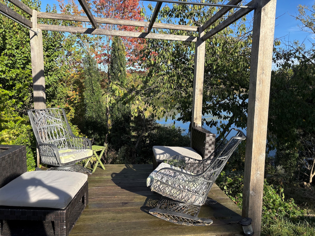 El paisaje panorámico es el telón de fondo de la serenidad en esta elegante casa; una vista pintoresca del lago, chimenea al aire libre, bosque encantador, pequeño estanque artificial y muchos avistamientos de ciervos. Cenador con mosquitero con mesa de comedor al aire libre y muchos asientos al aire libre, incluido un conjunto de salón. El interior cuenta con 2 dormitorios y un solárium con 2 sofás cama con vistas al lago. Bunkie terminado con baño completo disponible para más de 6 huéspedes. Se puede ir andando a Little Beach y a 7 minutos en coche de Big Beach. No hay acceso a la playa desde la propiedad.