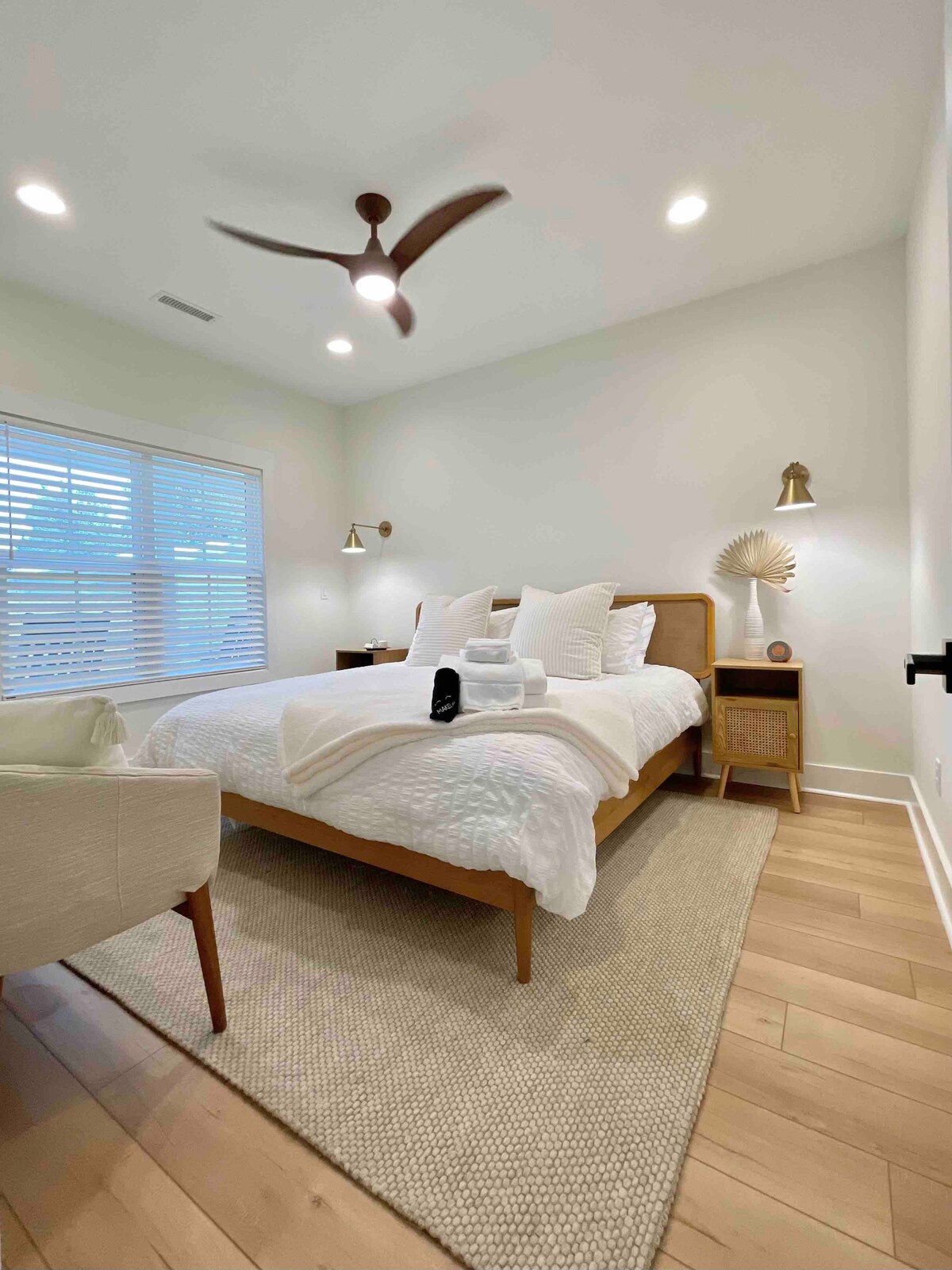 Esta suite de invitados consta de un dormitorio (cama tamaño king) y un baño completo. La entrada privada se encuentra en el porche delantero y el espacio está separado del resto de la casa. El espacio no incluye sala de estar ni cocina, pero hay una nevera pequeña, microondas, cafetera, zona de estar cómoda y un gran porche para relajarse. También hay un purificador de aire en la habitación, con filtración HEPA, que elimina el 99,9 de todas las partículas del aire. El espacio es del tamaño de una habitación de hotel promedio.