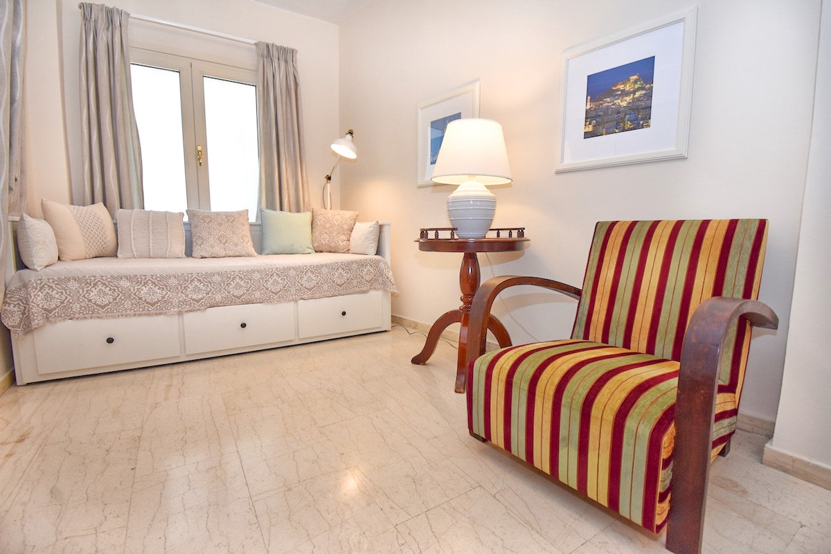 Mi casa(69 m2) es un apartamento de dos niveles en el corazón del casco antiguo de Corfú, a unos 300 metros de Liston y Spianada. Es una base perfecta para explorar la ciudad y la isla, situada en un barrio llamado Evraiki. Casi todo lo que necesitarás, como supermercado, restaurantes, panaderías, farmacia, etc., está a poca distancia a pie. Un aparcamiento municipal gratuito, una estación de taxis y una parada de autobús están muy cerca (60-100 m). La cama de invitados de la planta baja es convertible en una cómoda cama doble (1,60*2,00).