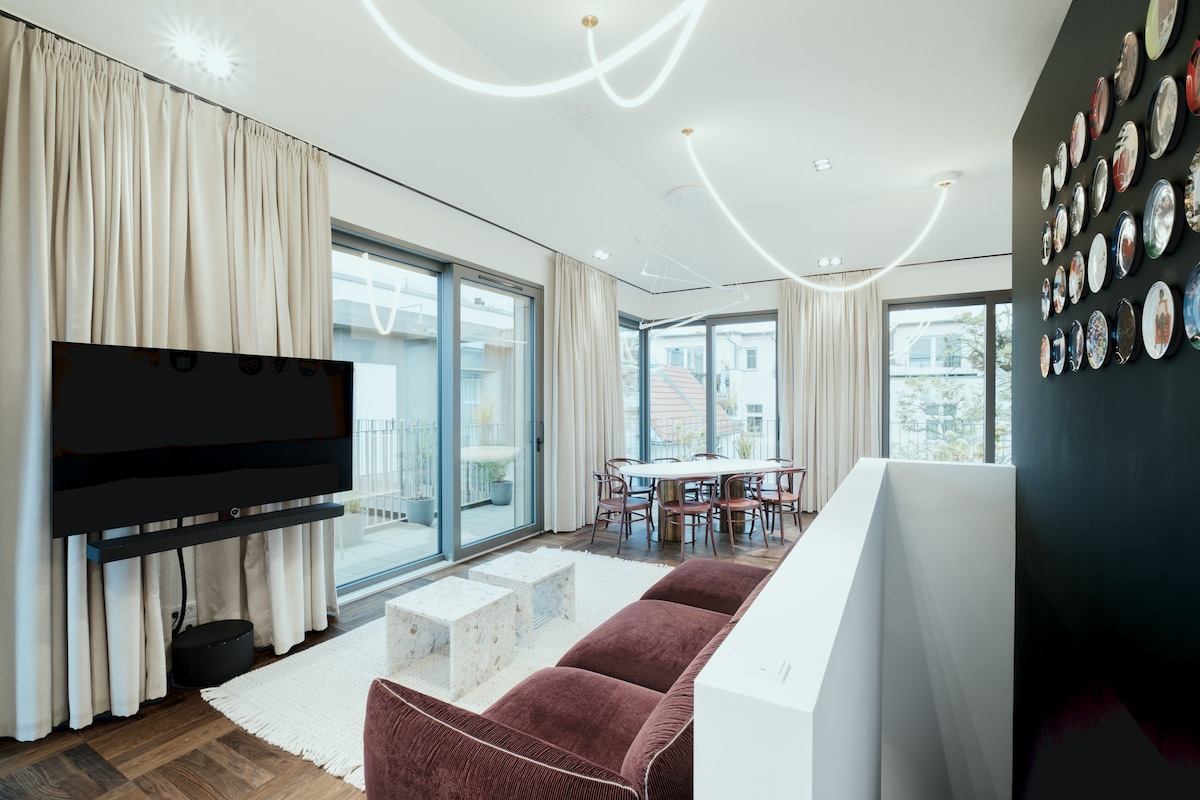 Este moderno apartamento se encuentra en el nuevo edificio de apartamentos Carlotta en el centro de Charlottenburg. Diseñado por los arquitectos berlineses Grüntuch-Ernst, el edificio de apartamentos se inauguró recientemente en 2023 y ofrece 8 categorías de diferentes tamaños que van desde los 32 hasta los 246 metros cuadrados. Todos los apartamentos están inundados de luz gracias a los techos altos y las ventanas que van del suelo al techo.