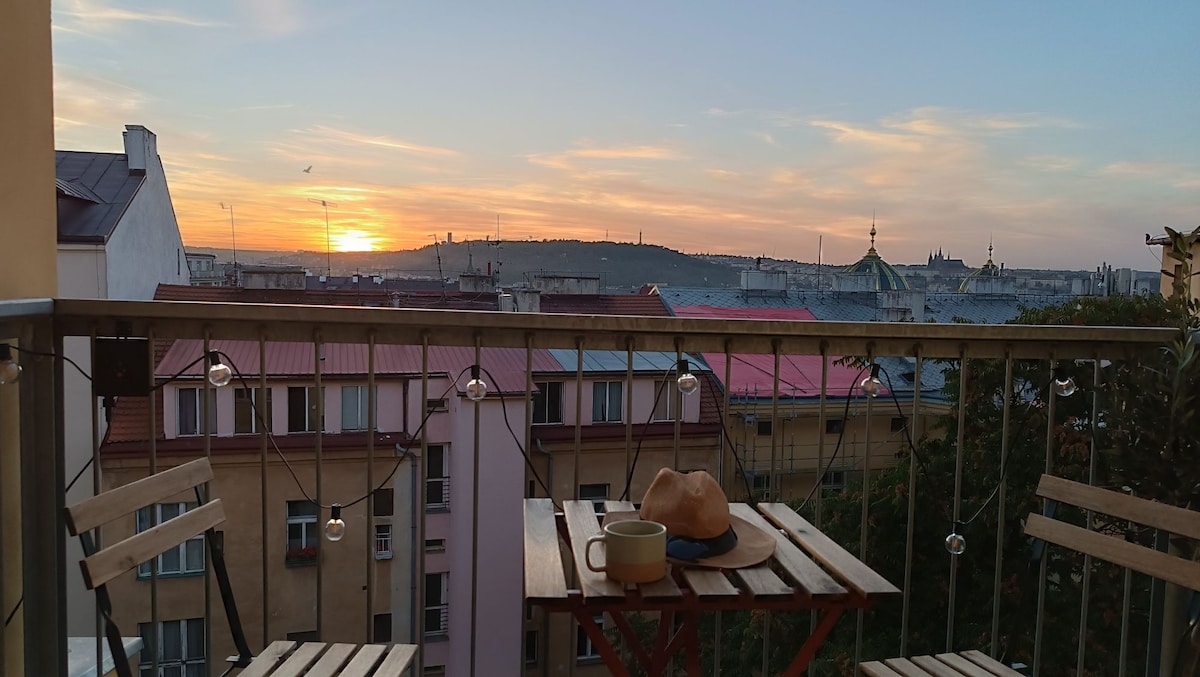 Has encontrado un lugar bonito hecho con amor a las puestas de sol y una vida cómoda y fácil :) - Punto increíble entre el casco antiguo y el nuevo: a 100 m de la plaza de Wenceslao, fácil acceso a todas las atracciones turísticas, metro A, B, C, tranvías por un lado y cerca de las zonas locales con muchos restaurantes (con buena cerveza y precios) por otro. - Todo el alojamiento será tuyo, incluido el balcón privado con excelentes vistas de las puestas de sol. - TV - Wifi rápido. - 6ª planta CON ascensor - Renovado en 2023. - Cocina totalmente equipada. - Llegada automática