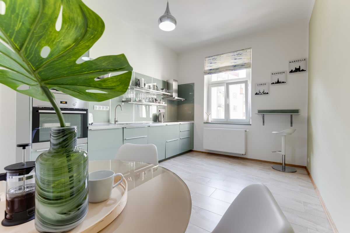 Alójate en Praga rodeado de lujo, arte y diseño. Un lugar elegante y tranquilo con todas las comodidades necesarias te abrazará cálidamente y permitirá una vida cómoda en la parte residencial más atractiva de la ciudad. Estamos deseando recibirte para tu estancia de media o larga duración. La suite está bien equipada y te da la bienvenida con una gran cocina y comedor, TV moderna con Apple TV, O2 TV y servicios de Netflix, dormitorio muy privado y acogedor (colchones de lujo, edredones de primera calidad) y material para hacer ejercicio como esterilla de yoga, mancuernas o cuerda para saltar.