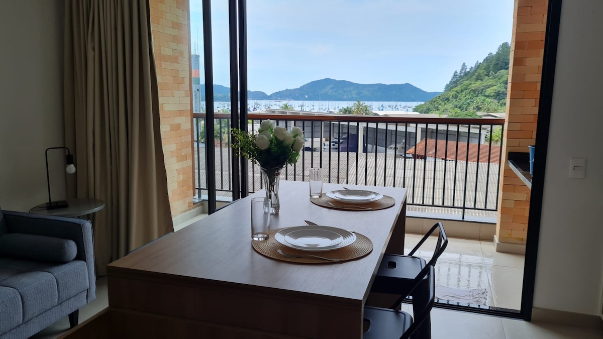 Relaxe após uma semana exaustiva neste espaço tranquilo e cheio de estilo. Por um fim de semana ou uma temporada mais longa - aqui você recarrega suas energias com vista direta para o mar. E piscina, academia se quiser mais movimento. A poucos passos das melhores Marinas do Saco da Ribeira e de praias maravilhosas. Um apartamento com todo o conforto para até 4 pessoas. O Apartamento é um Studio conceito aberto com muito charme e requinte, onde você e sua família poderão curtir momentos únicos.