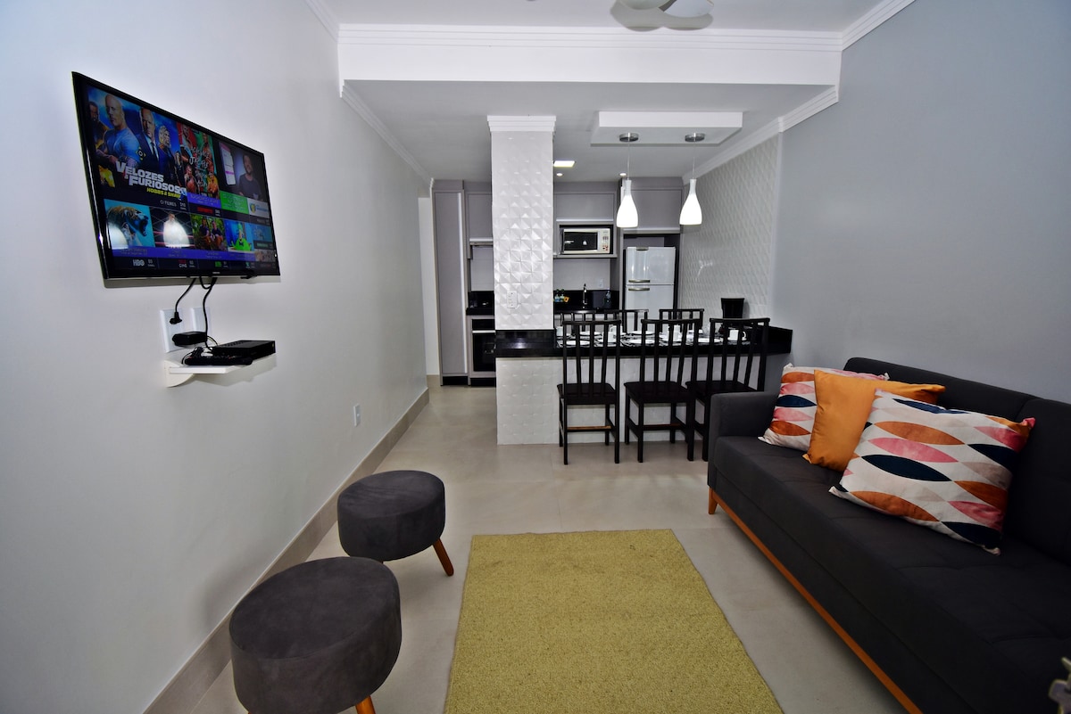 Apartamento sofisticado a solo 500 m de la playa en el barrio José Amândio. Totalmente equipado y climatizado, cuenta con un dormitorio con cama queen y smart TV, sala de estar con sofá cama y cocina completa. Disfruta de la parrilla y de la vista panorámica de la ciudad. El edificio ofrece piscinas climatizadas, jacuzzi, gimnasio, sala de juegos, estacionamiento cubierto y bicicletas que permiten explorar los alrededores de forma placentera. ¡Reserva ya y vive Bombinhas con confort y estilo!