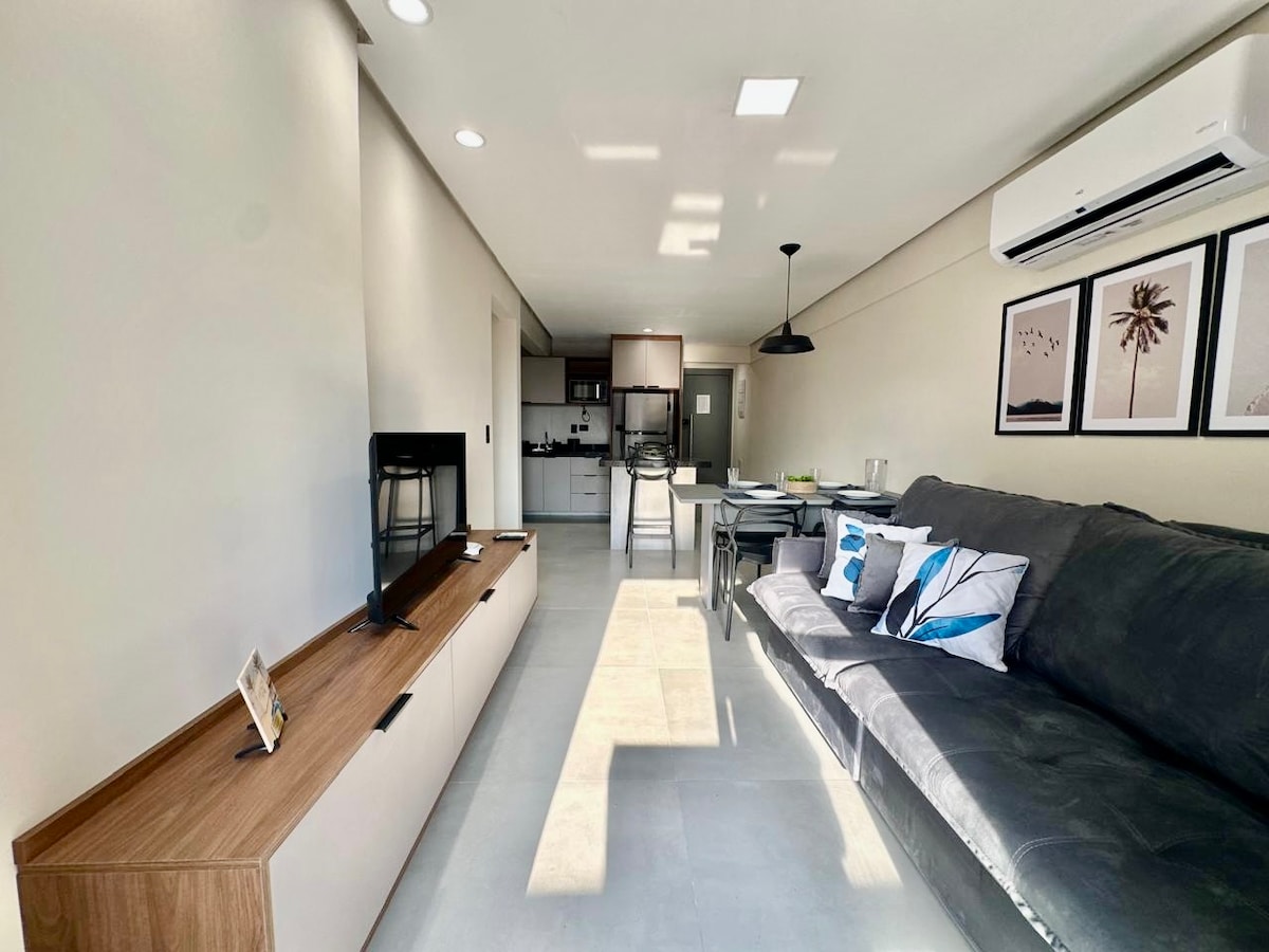 Apartamento moderno y completo a solo 3 minutos a pie de la playa. Cuenta con 2 baños en suite, un aseo, un salón con sofá cama integrado en la cocina totalmente equipada y un gran balcón gourmet con barbacoa eléctrica. Todo con aire acondicionado, con Smart TV en todas las habitaciones y wifi de alta velocidad en el apartamento y el edificio. Edificio de estilo resort con instalaciones de ocio completas. Se admiten mascotas. Ideal para familias y grupos. Tiene capacidad para 8 personas (cómodamente 6 adultos y 2 niños).