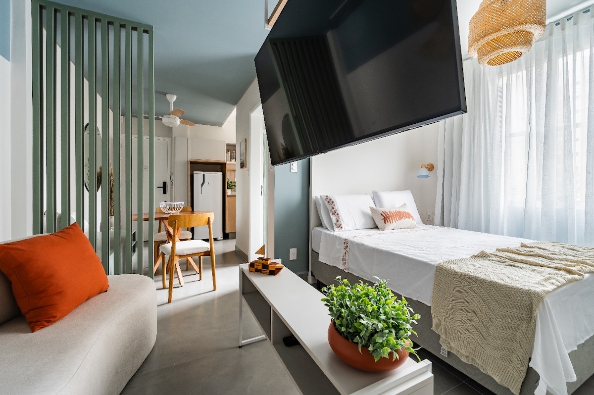 Apartamento tipo sala living, bem iluminado e arejado, com varanda espaçosa e vista para o mar, localizado no 5º andar de um prédio em frente à Praia do Gonzaguinha em São Vicente. O prédio é de frente para o mar entretanto o apartamento é lateral proporcionando noites tranquilas. Possui portaria 24h e 1 vaga de garagem garantida. Nas acomodações dispomos de ar condicionado split, quarto com cama de casal separado por porta de correr e um closet. Fornecemos roupa de cama e toalha de rosto.