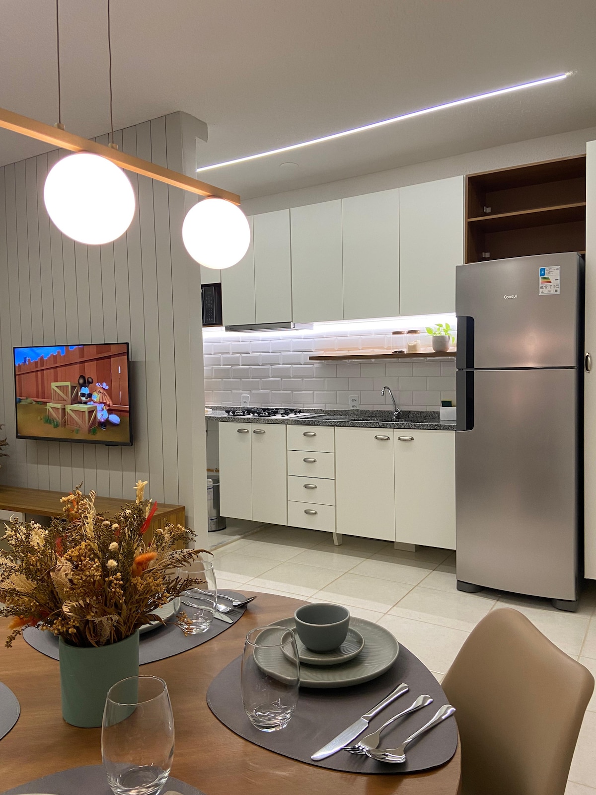Apartamento en el Tropical Executive Hotel, bellamente diseñado con preciosas vistas al río. Habitación con aire acondicionado, una cama tamaño queen Ortobom, 1000 vatios, TV de 45 pulgadas, wifi, mesa de comedor de 2 plazas y sofá. Cocina bien equipada con placa de 2 fuegos, estropajo, purificador de agua, cafetera Dulce Gusto + cápsulas, sartenes, licuadora, nevera, vajilla, utensilios de cocina y microondas.