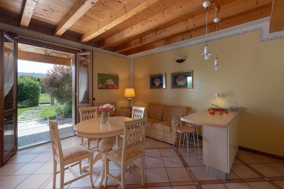 Una acogedora habitación con una entrada privada, sala de estar con cocina, dormitorio, jardín privado, todo en un oasis privado con dos piscinas, accesible de mayo a septiembre, y una pista de tenis a solo 200 metros del lago. A la espera de usted habrá desayuno italiano, ropa de cama limpia y mucha relajación. ATENCIÓN: No servimos el desayuno directamente todas las mañanas, pero a su llegada le ofrecemos una cesta con todo lo necesario para sus desayunos.