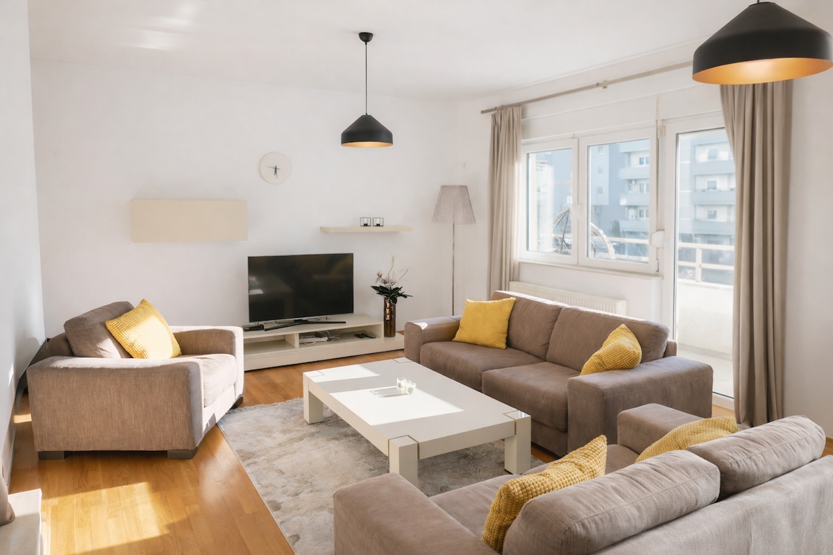 High above the center of Prishtina, few meters away from Marriott and Derand Hotel, this unique NEW apartment offers a rare blend of elegance and comfort. It invites you to slow down, breathe, and enjoy the city from a new perspective. Sunlight pours through windows, warming the soft tones and modern décor that make this home feel unique. Step onto your balcony to take in Prishtina’s skyline — the city hums below while you enjoy your morning coffee or an evening glass of wine under the lights.
