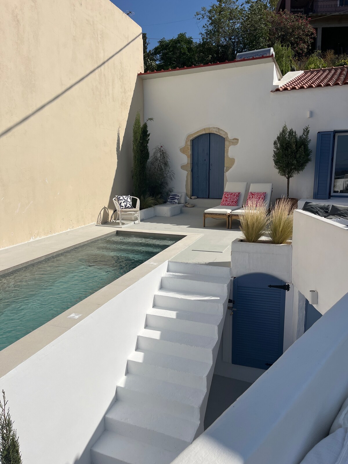 Villa Ovgoro ofrece una mezcla de sencillez y serenidad para aquellos que buscan una auténtica experiencia rural cretense mientras disfrutan de las indulgencias de una piscina privada, wifi y aire acondicionado. Los encantadores jardines se despliegan detrás de las puertas dobles de madera, revelando un oasis meticulosamente elaborado. En medio de una visión de la horticultura cretense, una piscina rodeada de árboles de limón, naranjos y granados, vibrante bougainvillaea, jazmín y gloria matutina que cae sobre macetas de barro y piedras de molino recuperadas.