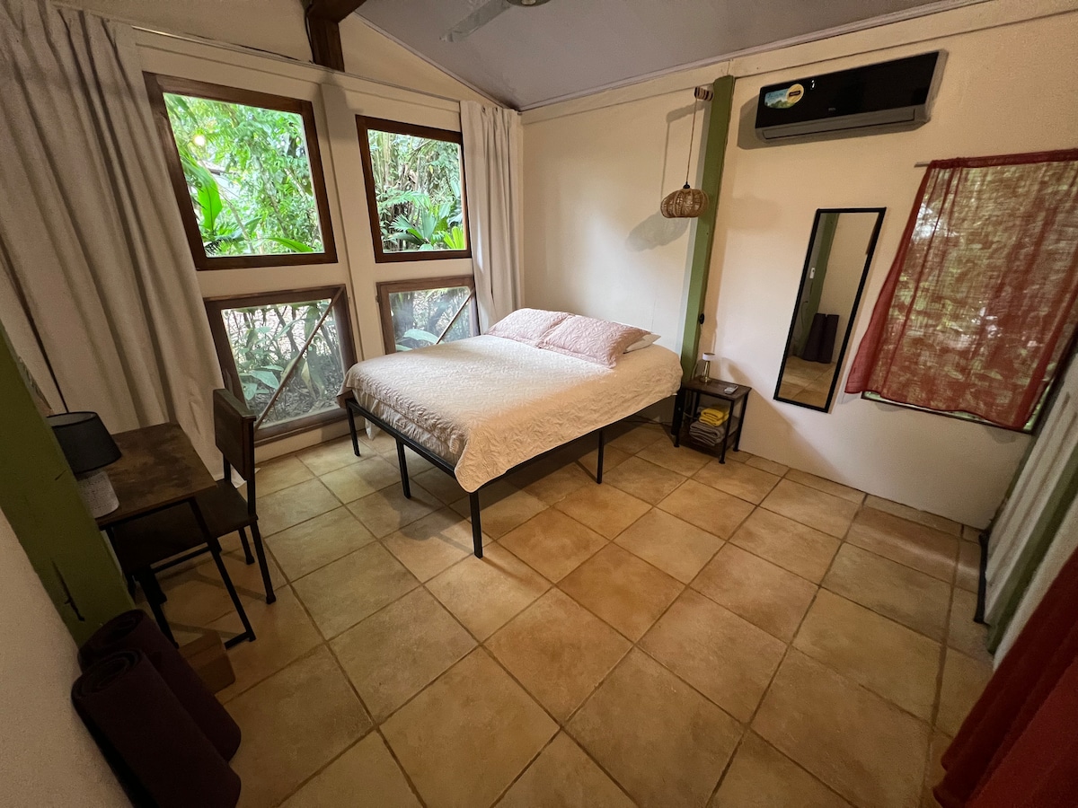 Bienvenido a Rooted in Love, tu casita en la selva con todas las comodidades modernas para experimentar cómodamente la selva. Este pequeño bungalow es perfecto para aquellos que quieren naturaleza accesible pero conectada a un pueblo tradicional tico. Desde tu habitación a menudo puedes observar a los monos titi saltando de árbol en árbol o aves magníficas en esta hermosa propiedad reforestada. Hay disponible un shala/templo de yoga, sedas y merkaba de bambú para meditar. ¡Ven a relajarte y sanar en la selva tropical!