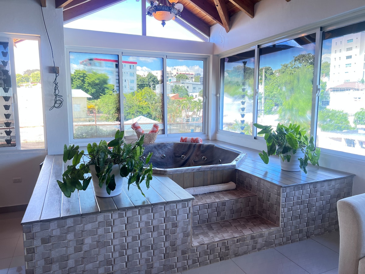 *400MBPS Wifi* Exclusivo penthouse nuevo en el piso 10 con 4 habitaciones modernas, bellamente decoradas y climatizadas, 5 Smart TV de 50” y 60”. La habitación principal tiene baño privado. Relájate en el jacuzzi GRANDE climatizado con agua caliente, BBQ y mini bar privado. Su balcón ofrece espectaculares vistas a las montañas de Santiago, al aeropuerto y a la ciudad, creando una experiencia única de lujo, confort y decoración exclusiva.