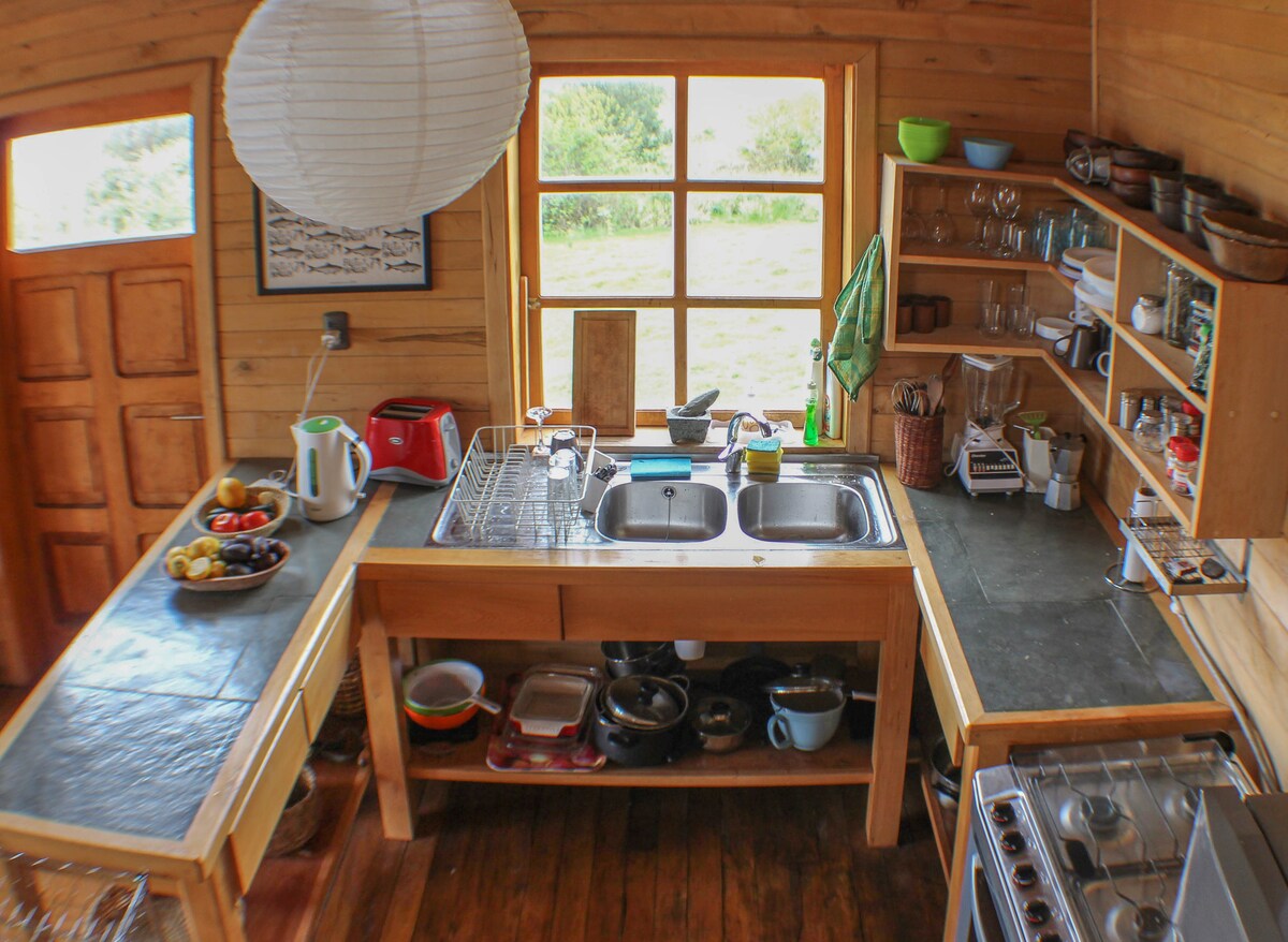 Incluido entre los "11 of the best Airbnbs in Chile" por The Culture Trip. La cabaña, de 55 m2, está en el sector de Yutuy en la península de Rilán, a 35 minutos de Castro y del aeropuerto. Es una antigua bodega de madera nativa rehabilitada, con una maravillosa vista a la bahía de Castro, hot tub gratuito y acceso directo a la playa. Es un lugar perfecto como punto de partida para recorrer la isla, por tierra o por mar. Se puede ir a Castro en lancha, en un viaje de 15 minutos.