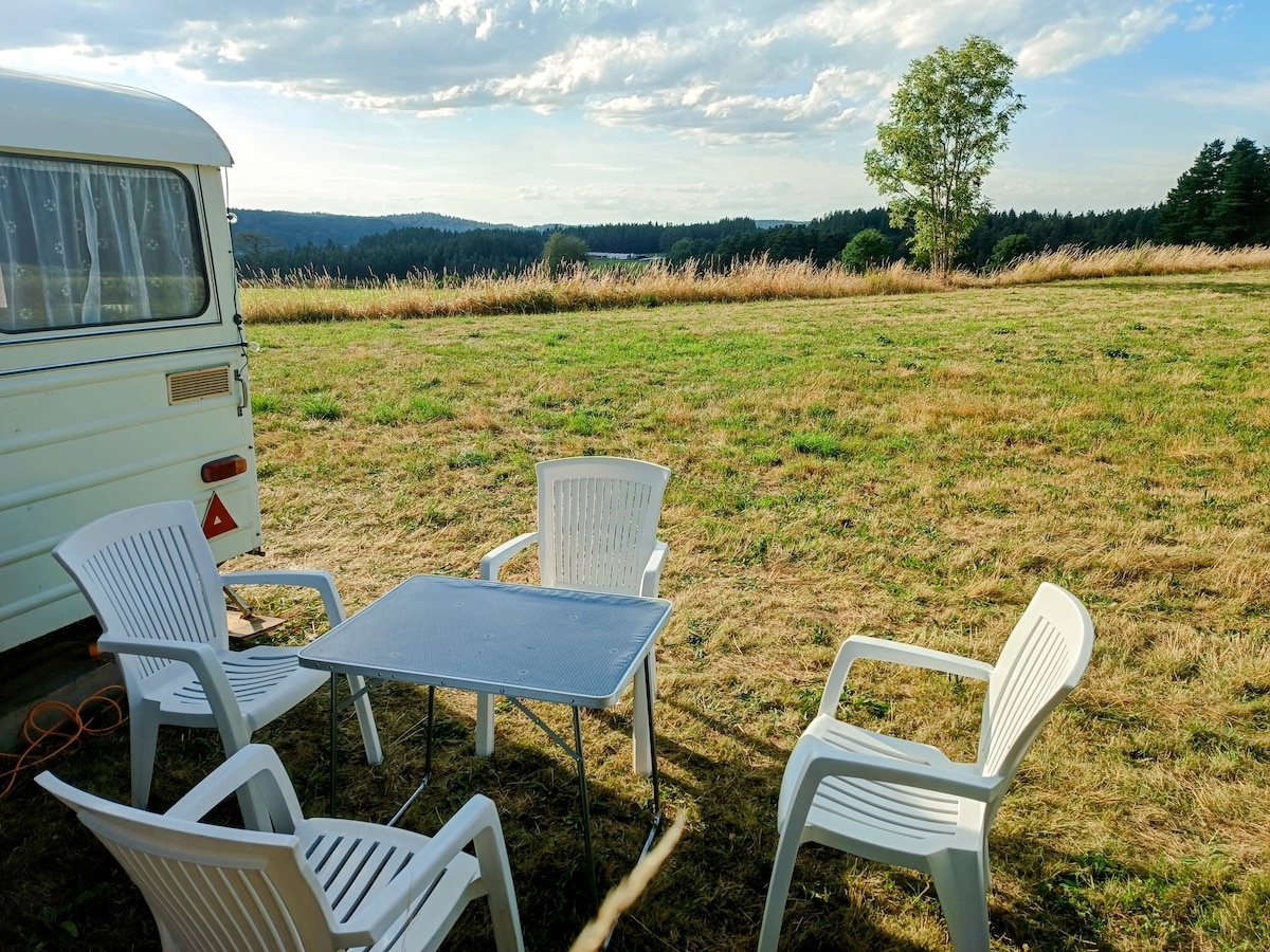 Caravana en pleno campo. Una habitación para dos personas y un sofá cama para dos personas. Cocina americana, barbacoa, tumbonas, pequeña piscina, posibilidad de alojar caballos en un prado. Inodoro seco, ducha al lado de la caravana. sin aire acondicionado. no fumadores. gracias