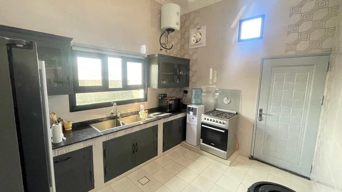 Esta elegante casa es perfecta para viajes para aquellos que buscan tranquilidad y recreación lejos del ruido. Está a 15 minutos del faro de Al-Ayja, a 5 minutos de Khour Grama y a 35 minutos de la granja de tortugas y Ras Al-Hadd.