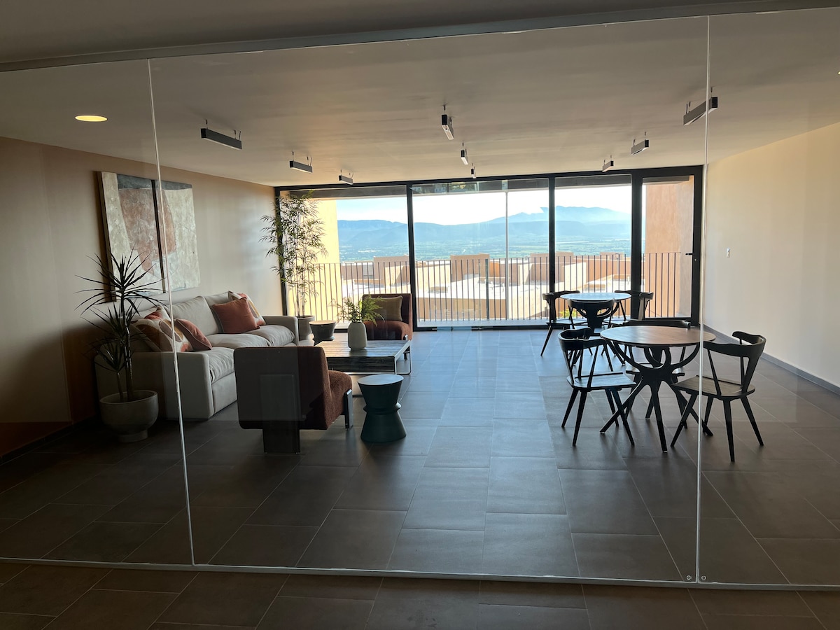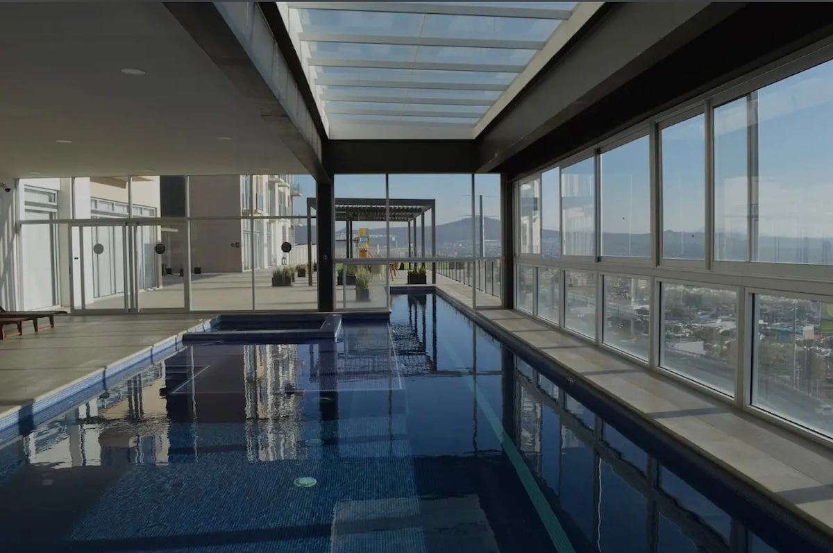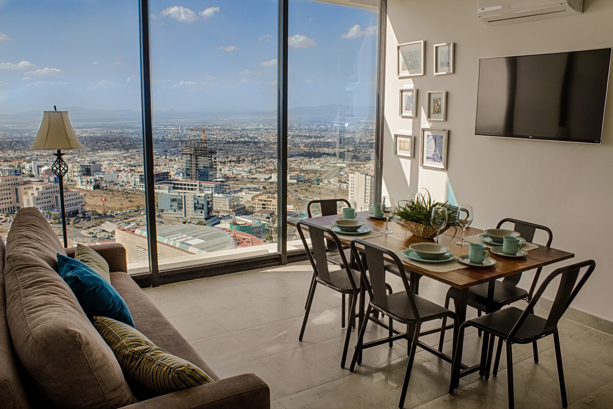 ¡La mejor vista desde tu cama! Cómodo departamento de lujo y estilo alegre con todas las amenidades como alberca, roof garden, ludoteca, business center, vigilancia 24/7 y gym. Disfruta la nueva zona chic de Querétaro, con la mejor vista de la ciudad y de la reserva natural del Tángano. Muy cerca de la terminal de autobuses, la salida a la carretera a la CDMX y de la salida al aeropuerto de Querétaro. Facturamos tu estadía. Importante confirmar el no de huéspedes