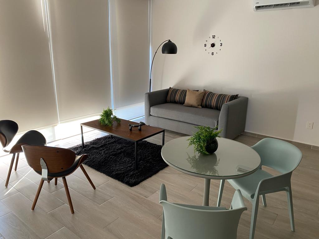 EDIFICIO "LA GOTA" entre Plaza del Parque y Plaza Boulevares Terraza privada, con mesa y 8 sillas WiFi de alta velocidad SmartTV (Roku) en la sala y en la recamara principal Comodo escritorio con contactos y puerto USB por si necesitas trabajar Cocina con estufa, microondas, refrigerador, licuadora, cafetera, vajilla, utensilios de cocina y purificador de agua de 5 etapas Lavadora y secadora Entrada con chapas digitales, entra y sal cuando lo necesites No se aceptan mascotas