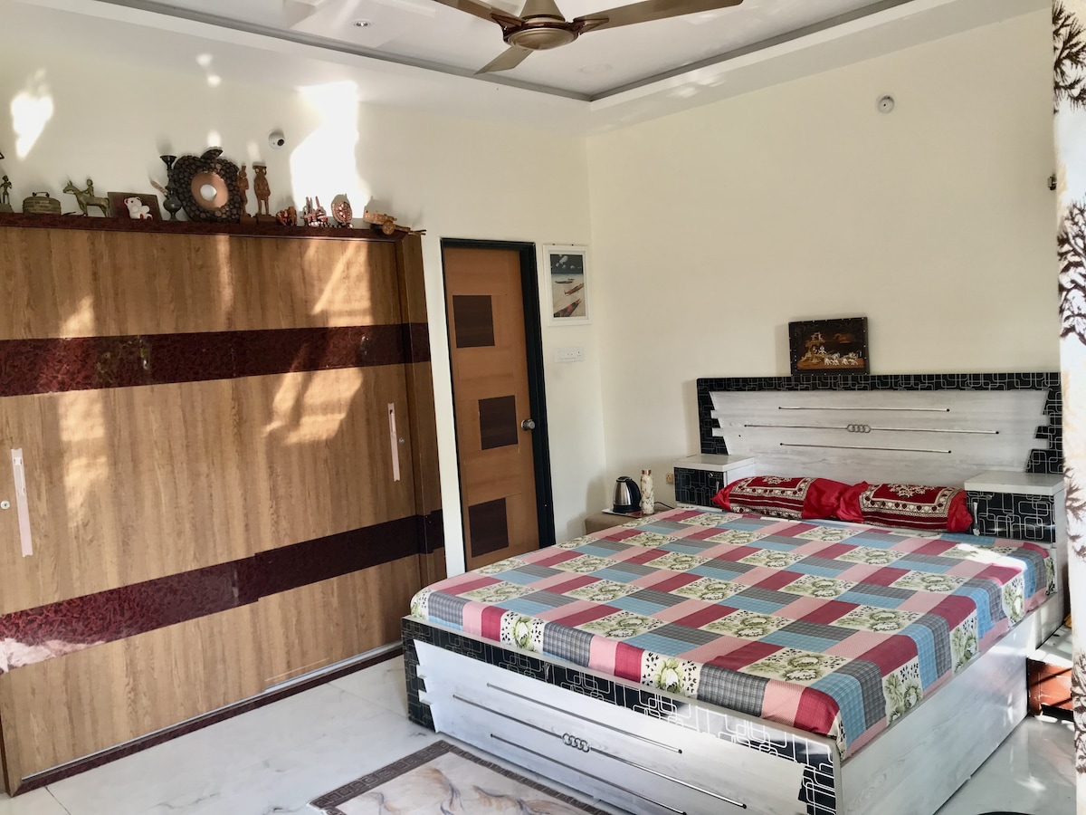 Madhuvan tiene 3 habitaciones en el primer piso. 2 habitaciones tienen baños adjuntos. El límite de 5 personas puede superarse bajo petición con camas/colchones adicionales. Madhuvan es una casa tradicional, con servicios básicos. Zonas comunes que compartirán todos los huéspedes y propietarios: - Sala de reuniones de oficina. - 2 balcones grandes. - Despensa de autoayuda, lavadora, El balcón delantero da a Marine Drive, el lago más famoso de Raipur, dominado por la Tiranga más alta de la India y un exuberante jardín verde. El balcón trasero está abierto al cielo para secar la ropa.