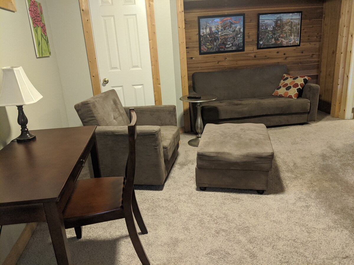 Entra por una entrada privada a este apartamento tipo estudio en el sótano. Construido recientemente en 2018, el espacio está bien iluminado, aislado y en un barrio tranquilo. Disfruta de un baño completo con lavandería y una pequeña cocina: nevera de 4,5 pies cúbicos, microondas, horno tostador extra grande, placa calefactora, olla de barro, ollas, sartenes, platos, cafetera keurig y fregadero de cocina completo. 1 cama tamaño queen con capacidad para dos personas. Los huéspedes deben tener al menos 3 evaluaciones positivas de estancias para reservar nuestro espacio.