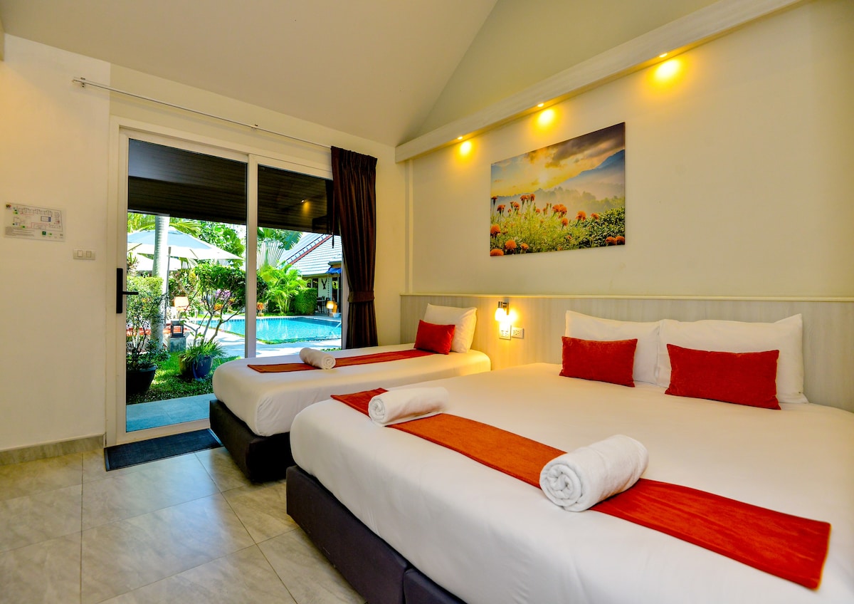 Esta increíble habitación con vistas a la piscina cuenta con todas las comodidades que necesitas. Desde tu habitación tienes acceso directo a nuestra zona de piscina. ¡El precio incluye traslados gratuitos al aeropuerto las 24 horas! Dentro de la habitación tienes una cama tamaño king y una individual con sábanas. El baño privado tiene una ducha con toallas, champú y jabón. En la habitación tendrás un televisor LED con conexión vía satélite. También hay una nevera, café, té y agua gratis.