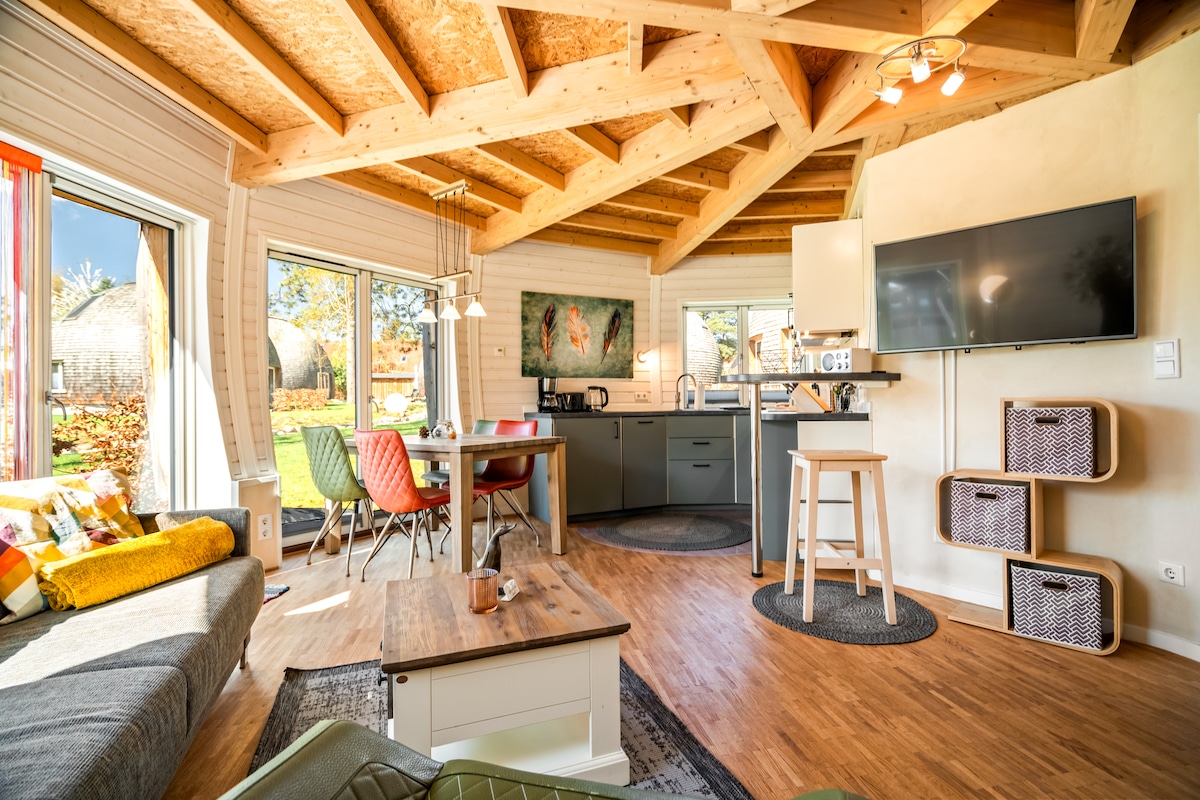 En este acogedor alojamiento para 2 - 4 personas sin duda te sentirás muy cómodo. Los 55 metros cuadrados estarán amueblados con muchos detalles individuales. Todavía estamos en proceso de renovación, te seguirán las fotos del interior. Es posible tener unas vacaciones completamente aisladas o buscar encuentros con los huéspedes de las 3 tiendas de campaña de glamping. Ofrezco caminatas semanales, talleres de hierbas y cocina de fogatas. Si quieres puedes ajardinar conmigo descalzo... (es una experiencia) ;-D