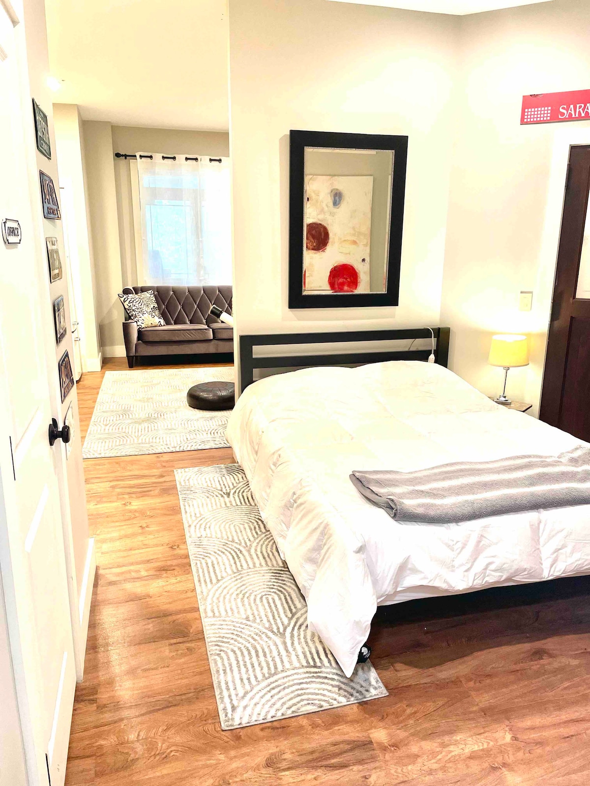 Experimenta la comodidad de nuestra suite con dormitorio y jardín, completa con un baño completo y una acogedora sala de estar con chimenea y cocina americana. La suite tiene una entrada independiente, lo que garantiza una privacidad completa, y se puede acceder cómodamente desde el garaje adjunto. Ubicada en un tranquilo entorno suburbano, nuestra casa privada ofrece un ambiente luminoso y moderno. La suite puede alojar cómodamente hasta cuatro huéspedes, con dos camas dobles para garantizar una estancia relajante.