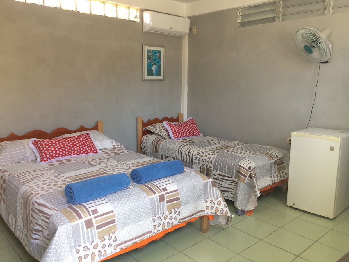 Habitación con entrada independiente y Wifi 24 horas en la 2da planta de nuestra casa con llave privada para los huéspedes, cuenta con 1 habitación para 3 personas con 2 camas, baño privado con agua caliente/fría, aire acondicionado, cocina, terraza privada al aire libre y cubierta de una mata de uva. Se encuentra en un barrio tranquilo de nuestra ciudad, frente al Teatro Heredia y a unos 200m de la Plaza de la Revolución, igualmente del Centro Comercial La Gran Piedra.