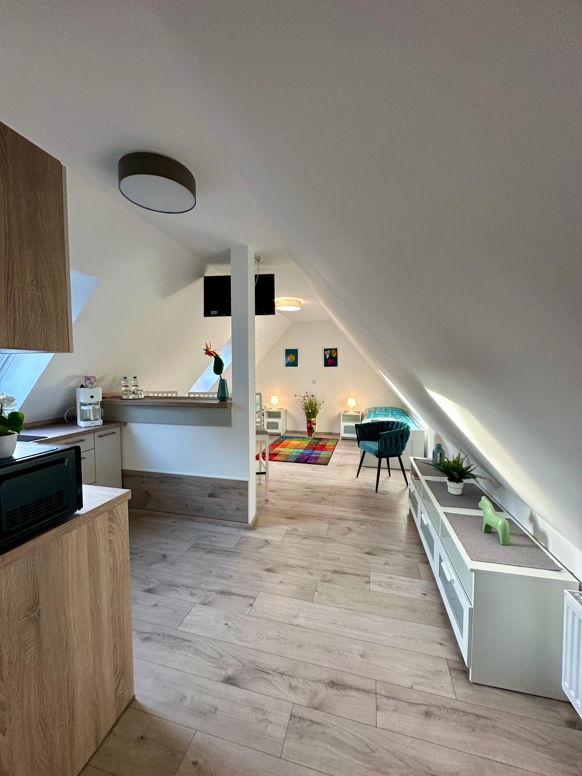 Hermoso y luminoso apartamento de vacaciones (ático completo con planta de 95m2 o sala de estar de 65 metros cuadrados). Instalaciones: Dos dormitorios (1. con cama de matrimonio / 2. con 2 camas individuales), amplio salón con cocina abierta y mesa de comedor, cocina totalmente equipada (estufa de inducción, horno, tostadora, hervidor, cafetera...), WLAN, TV, acogedora sala de estar, bodega con cerradura.