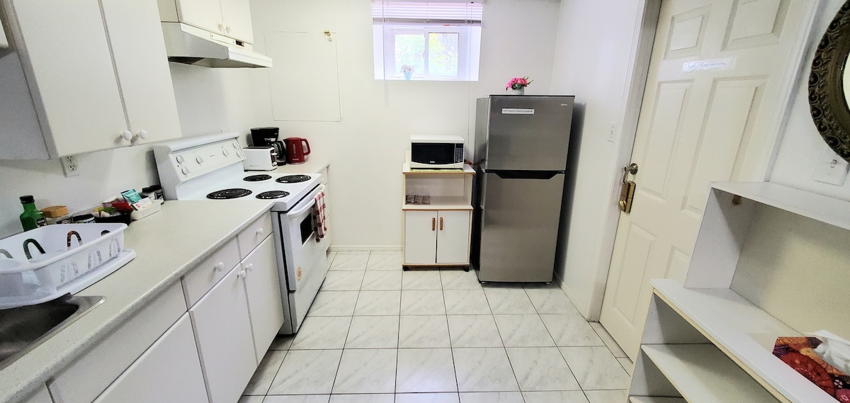 A walk-out basement apartment in Richmond Hill. This sunlit apartment has abundance of natural lighting streaming through the many large windows. It has a full kitchen, a full laundry room with a washer and dryer, a designated parking space for one car, and free Wi-Fi access. Perfect for couples or small families, this apartment comfortably accommodates two adults and up to two children.
